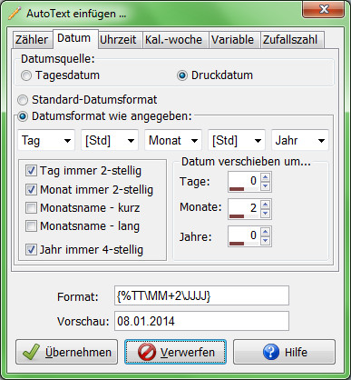 Natürlich muss man sich dies nicht alles merken. Welche Zeichen wofür stehen und welche Parameter bei welcher Auto-Text-Funktion möglich sind, kann bequem über einen Dialog eingestellt werden.
