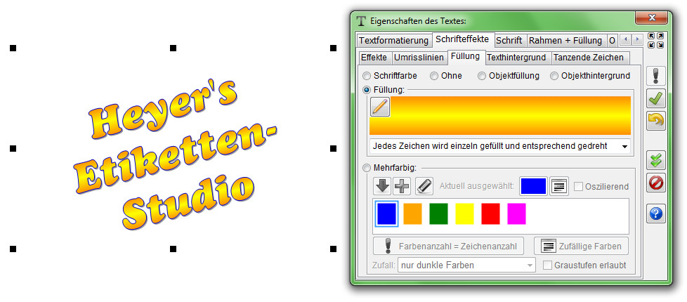 Dazu können noch eine Reihe von Schriffteffekte wie z.B. Schattiert oder Umriss angegeben werden.