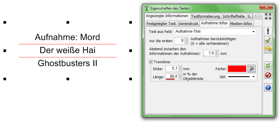 Anstelle eines festen Textes können auch direkt die Informationen zur Blu Ray, DVD bzw. Video-Kassette oder zu den Aufnahmen ausgegeben werden. Dafür kann auf Informationen zurückgegriffen werden, die durch Heyer's Etiketten-Studio in separaten Dateien verwaltet werden.