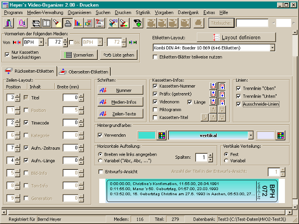 Wie oben angezeigt, können sowohl Rückseiten- wie auch Oberseiten-Etiketten gedruckt werden. Dabei sind Schriftarten, -größen und Farben wählbar. Es kann das jeweilige Etiketten-Layout ausgewählt werden. Es werden eine Reihe von fertigen Layouts angeboten, es können aber auch über Layout definieren eigene Layouts erstellt werden.